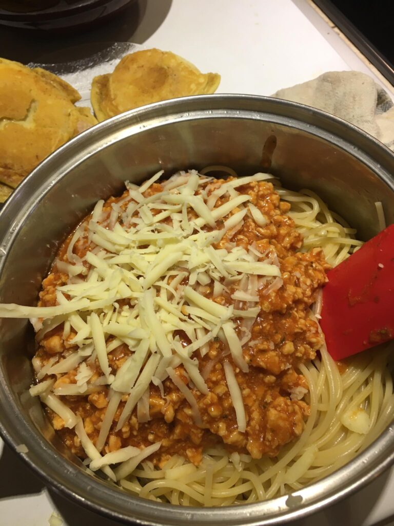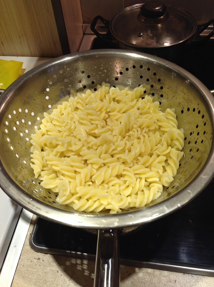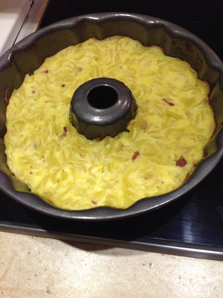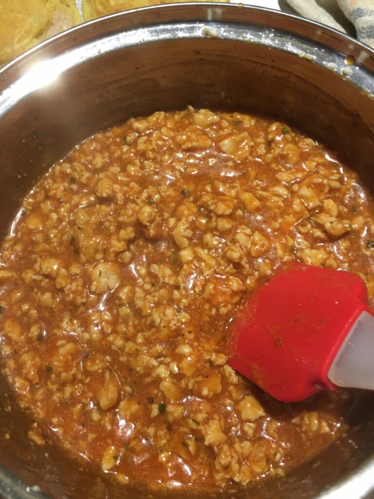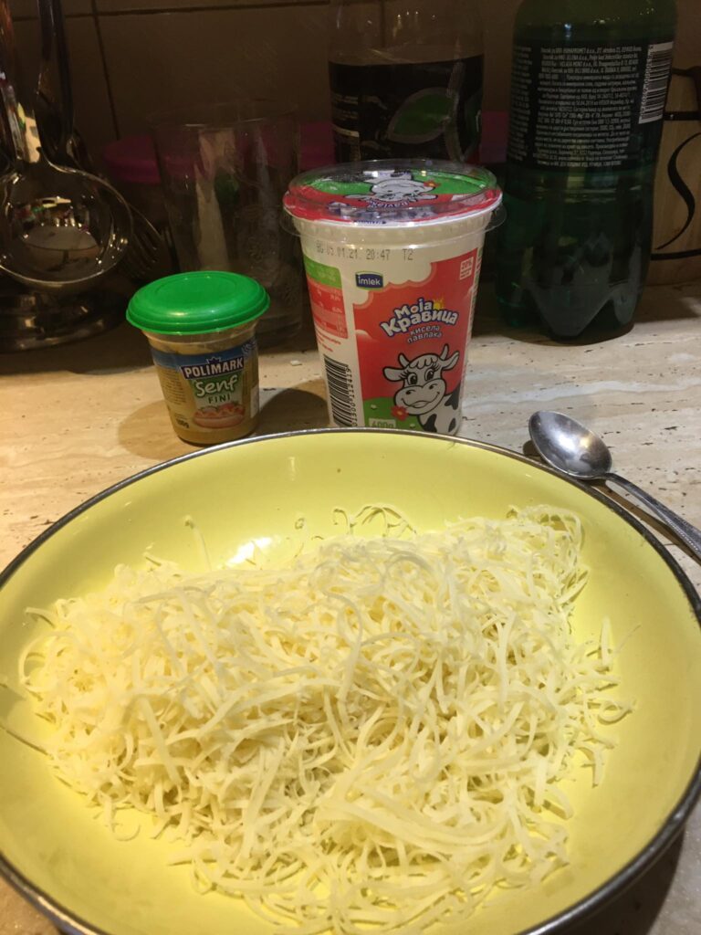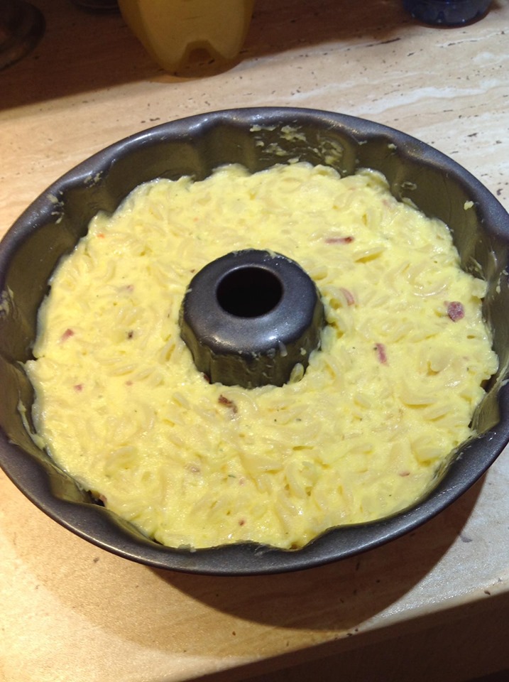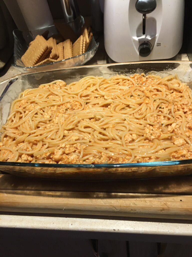 A darált húst megdinszteljük olajon, a bolognai öntetet vízzel kikavarjuk, majd leöntjük vele a húst. A tejfelt kikavarjuk a tojásokkal. Majd megtöltjük vele a csőtésztát. Ha marad hús, akkor belekeverhetjük a tejfeles öntetbe.