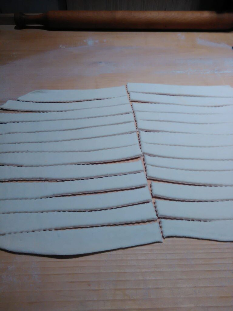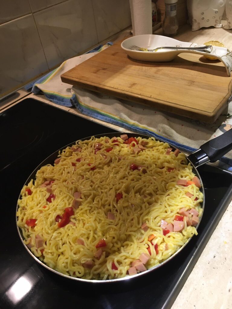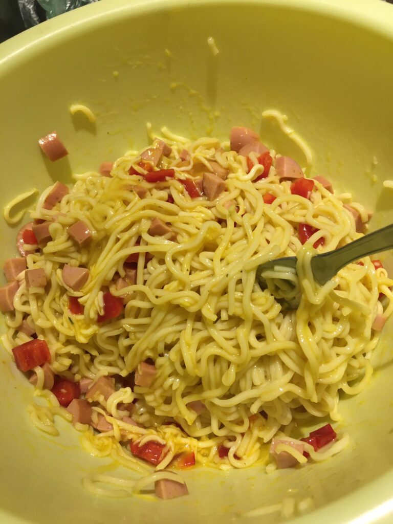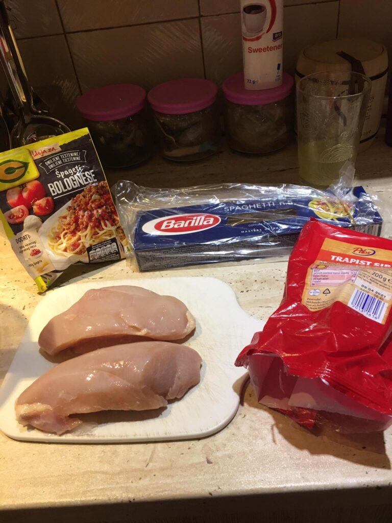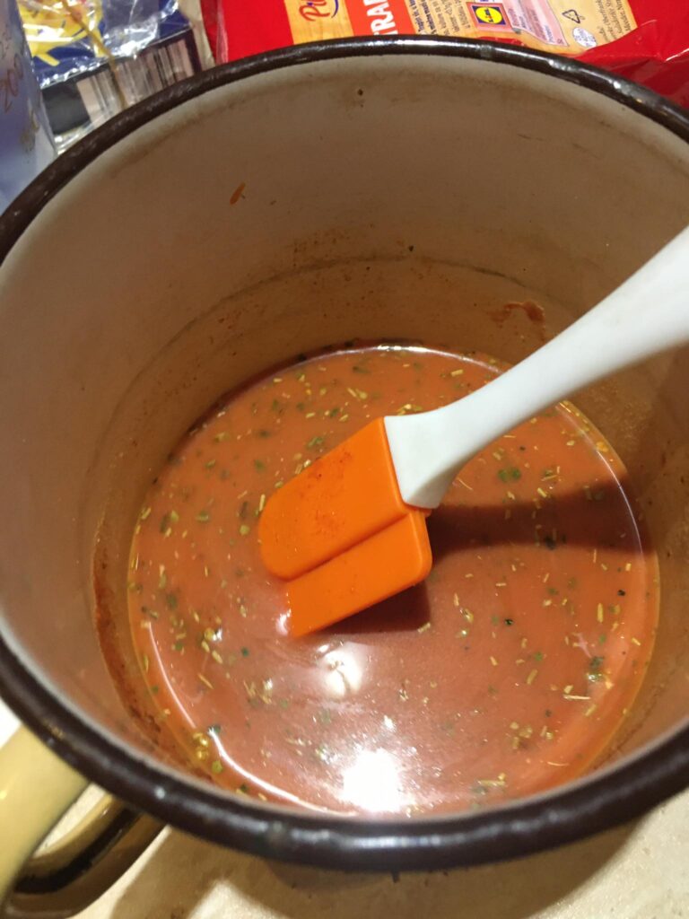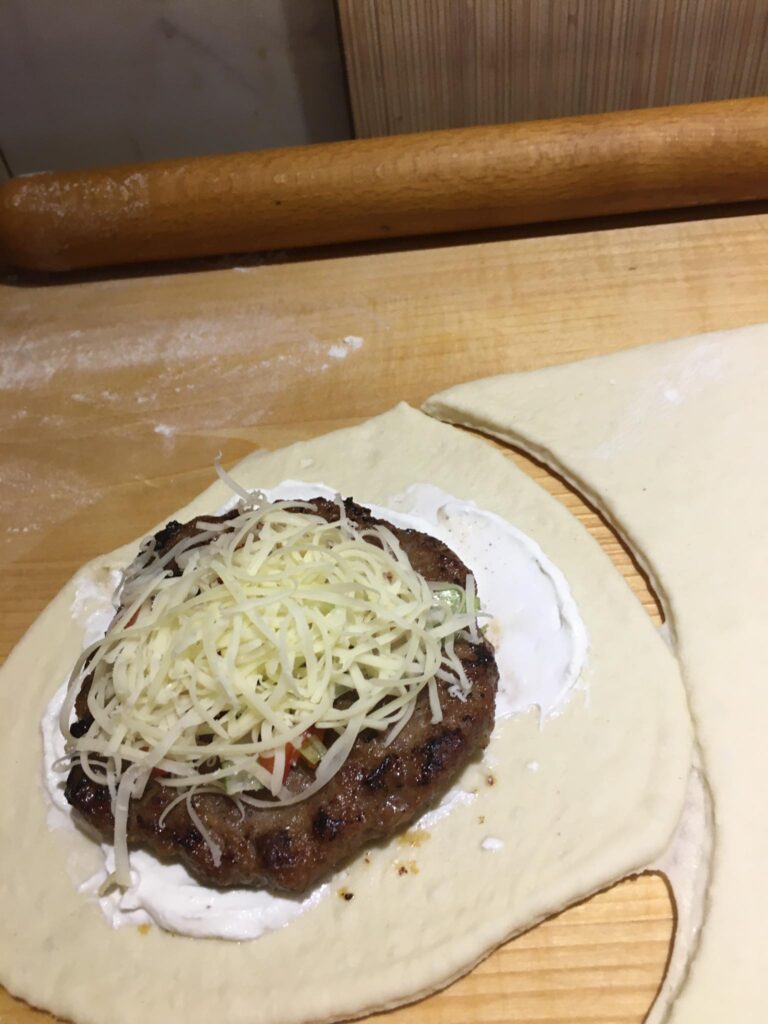 A darált húst megdinszteljük olajon, a bolognai öntetet vízzel kikavarjuk, majd leöntjük vele a húst. A tejfelt kikavarjuk a tojásokkal. Majd megtöltjük vele a csőtésztát. Ha marad hús, akkor belekeverhetjük a tejfeles öntetbe.