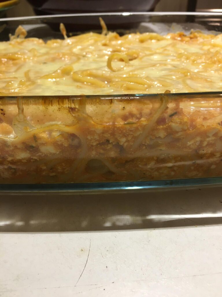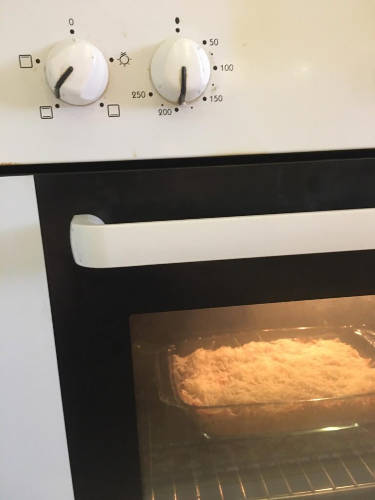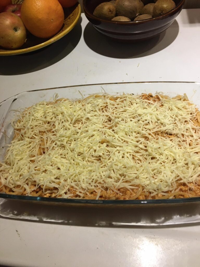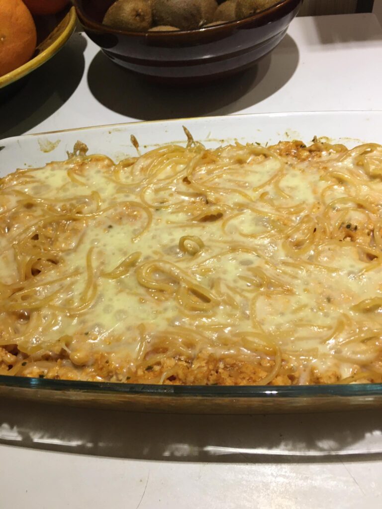 Egy jénai vagy bármilyen tepsit megkenjük a tejfeles öntettel, majd a megtöltött cannelonit megforgatva sorba rakjuk benne. Ezután leöntjük a tejfeles masszával, lefedjük fóliával és a sütőbe tesszük. Mikor már megpuhult a tészta, akkor sajtot szórunk rá és 5 percre visszatesszük a sütőbe.