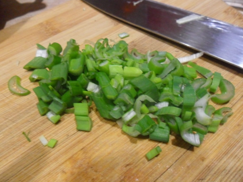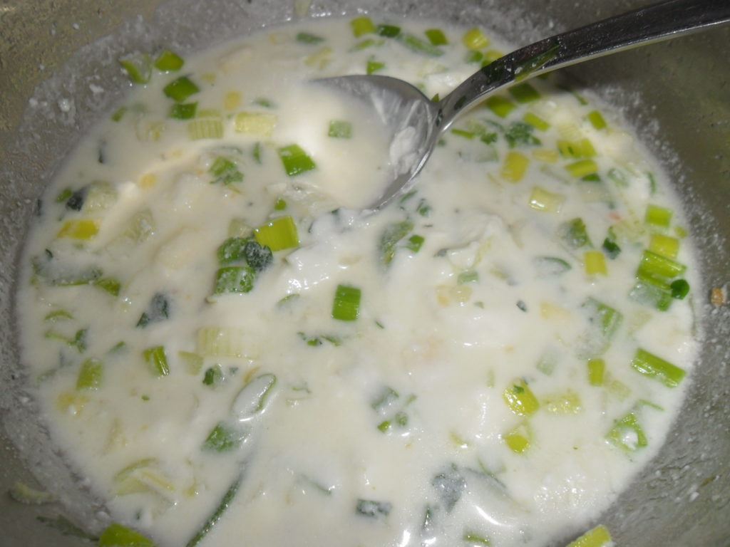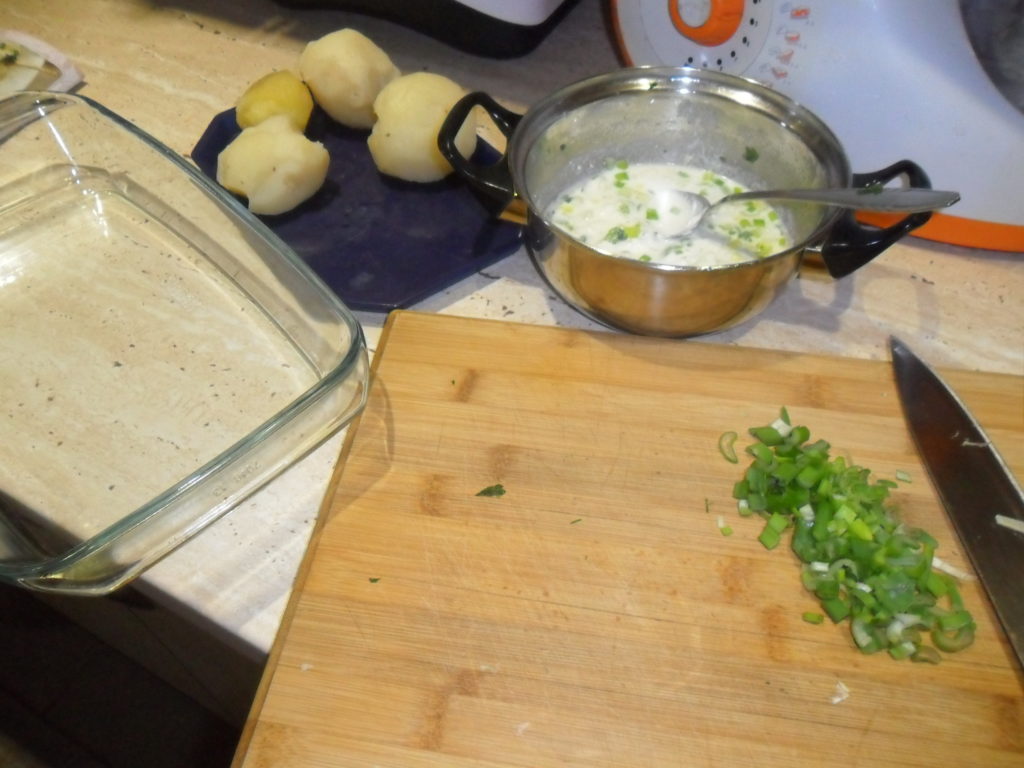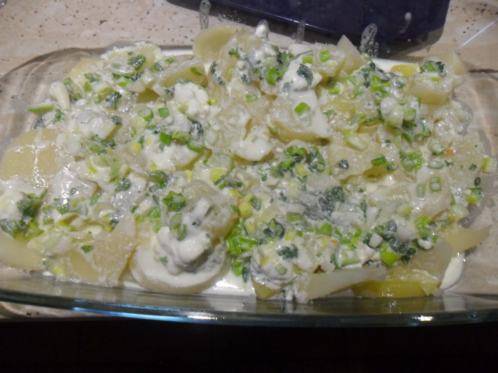 A krumplit megfőzzük héjában, majd megpucoljuk és karikákra vágjuk. Ezt egy edénybe tesszük (én jénaiba tettem), A leves lébe egy kiskanál mustárt keverünk, majd hozzáadjuk az apróra vágott hagymát, sót, őrölt borsot, tejfelt, és az almaecetet. Ezzel az öntettel leöntjük a krumplit. Erre rászórjuk az apróra vágott újhagymát és a zöldség zöldjét,amit szintén apróra vágtunk.