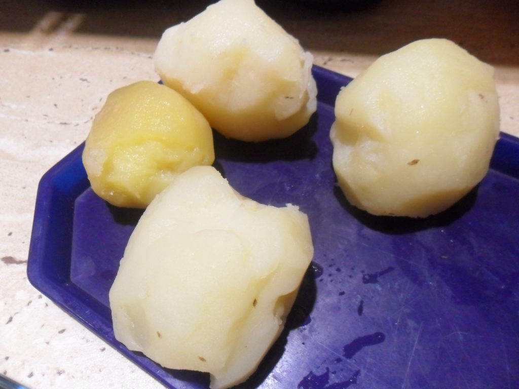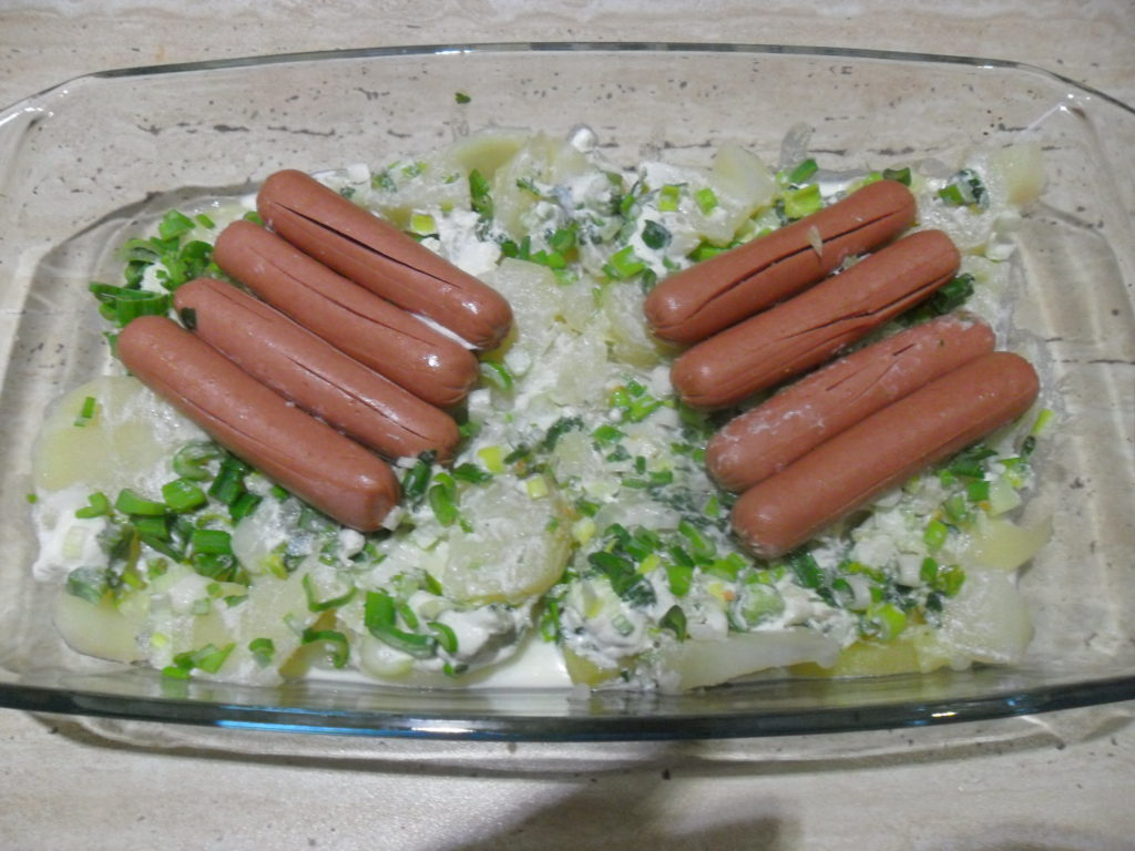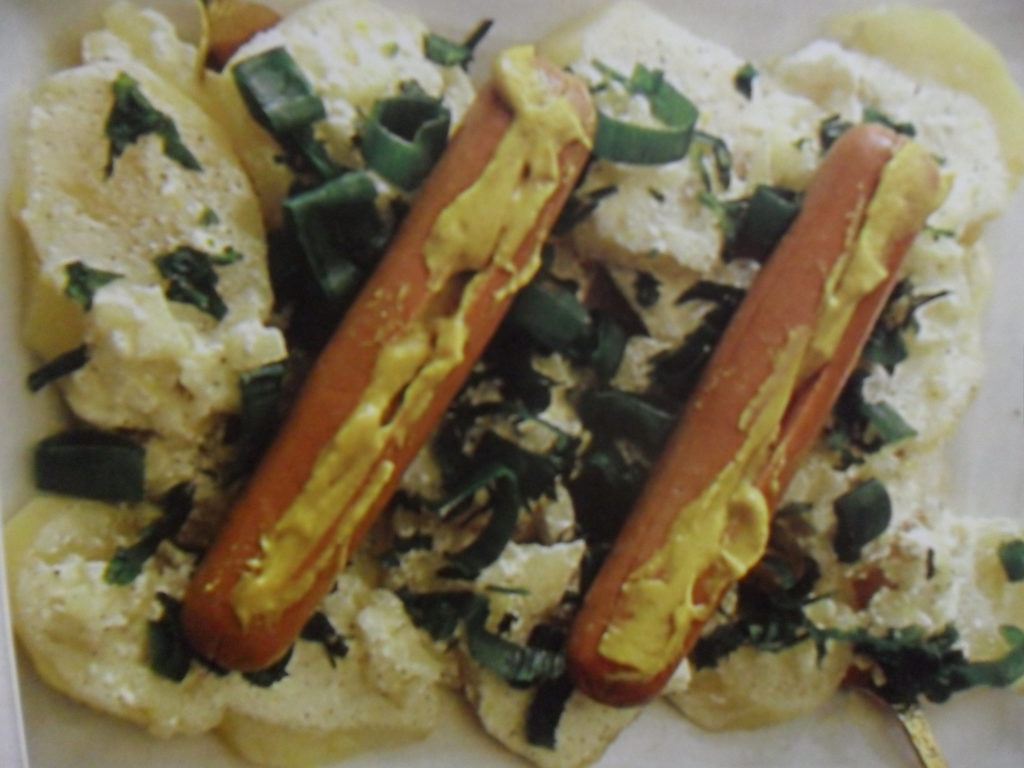 4 közepes héjában főtt krumpli, 1 dl leves lé, 2-3 kiskanál mustár (szenf), 1 kisebb fej vöröshagyma, so, bors, 1 dl tejfel, 2 kanál almaecet, zöldség zöldje, 3-4 újhagyma, 6 darab főtt virsli